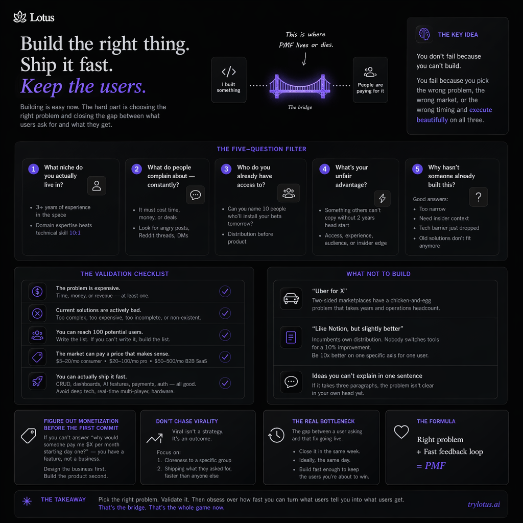 Pick the right problem. Validate against the filter. Then obsess over how fast you can turn what users tell you into what users get.